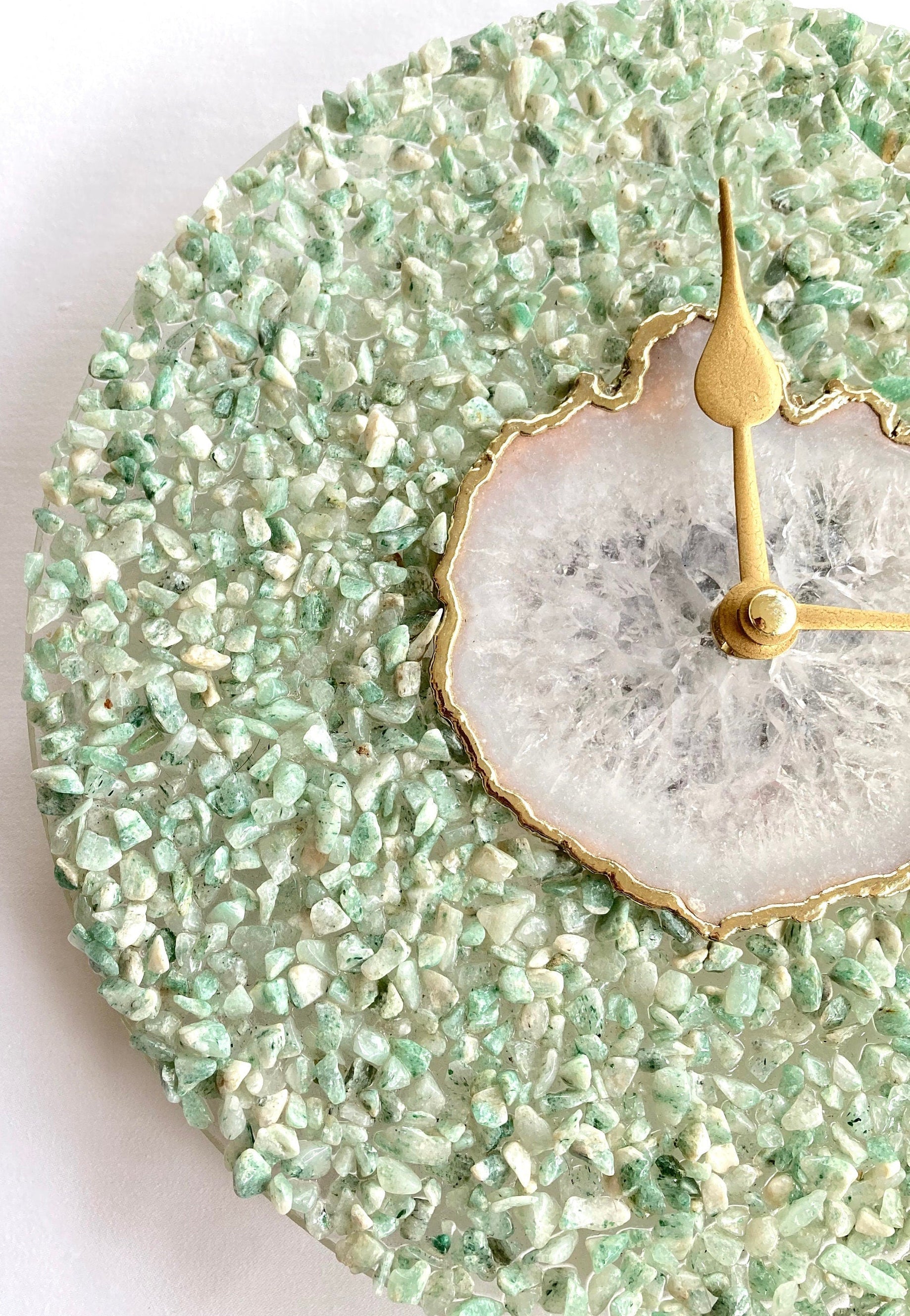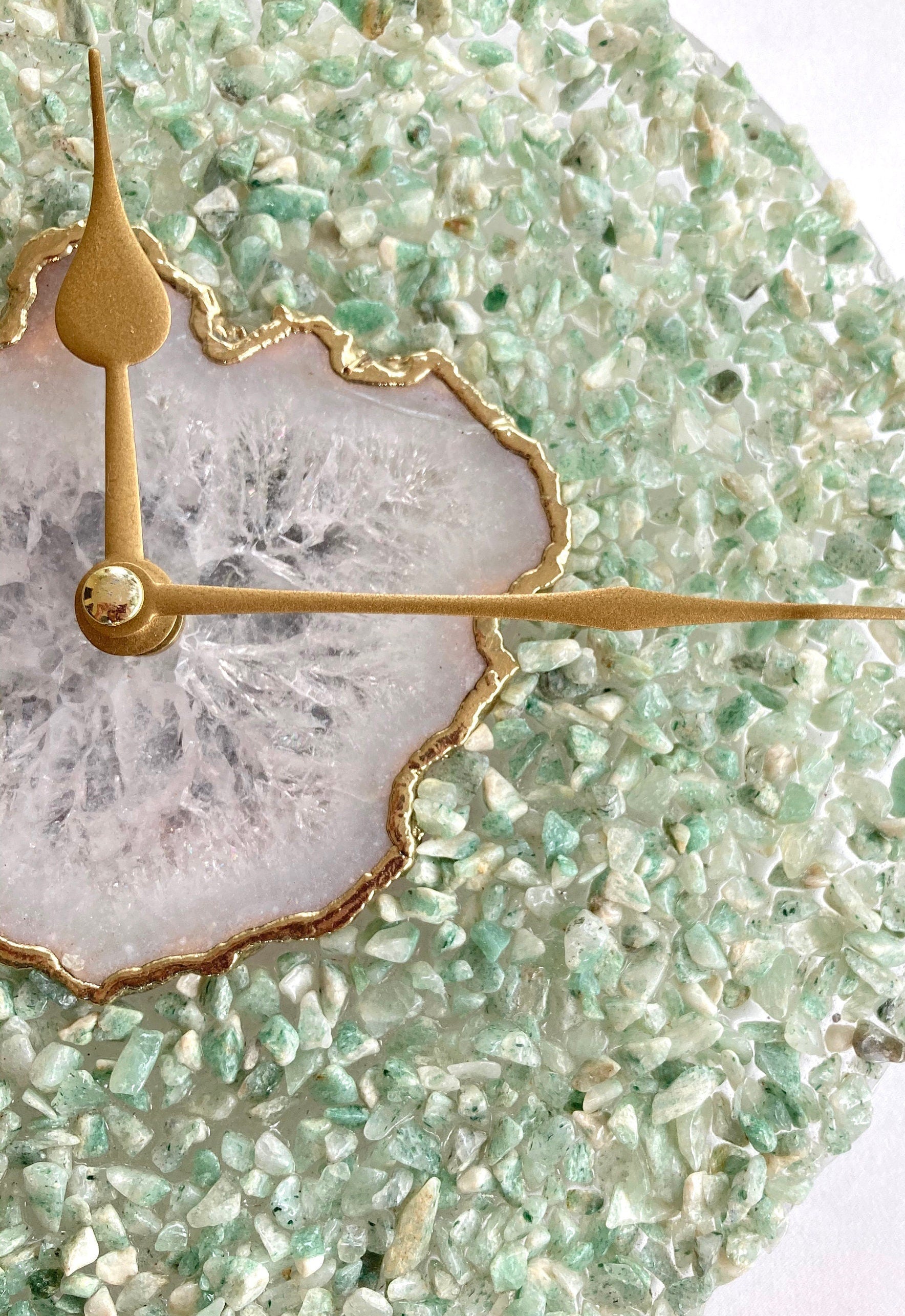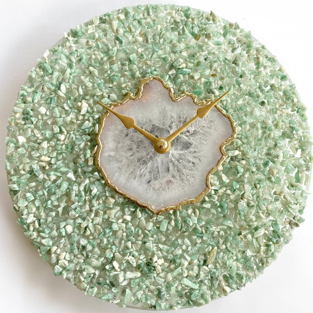 Zegar o średnicy 10 cali tworzy misternie ułożona mozaika z kawałków naturalnego agatu i kryształu, formująca idealny okrąg. Krawędzie każdego kamienia zostały uszlachetnione grubą warstwą naniesioną metodą galwanizacji. Proces ten zapewnia wyjątkową trwałość i odporność na ścieranie, w przeciwieństwie do nietrwałego złocenia płatkowego.