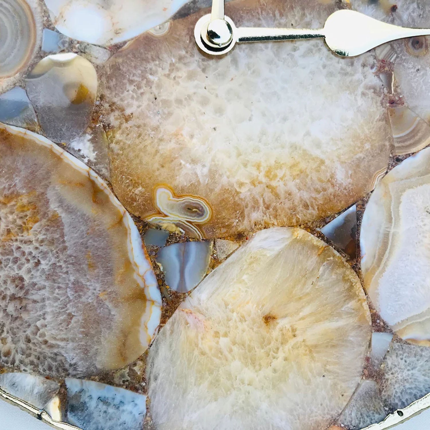 - Naturalny Agat: Tarcza zegara to 10-calowy (około 25 cm) okrąg, misternie ułożony z plasterków autentycznego brązowego agatu. Każdy kawałek kamienia jest unikalny, tworząc niepowtarzalny wzór.