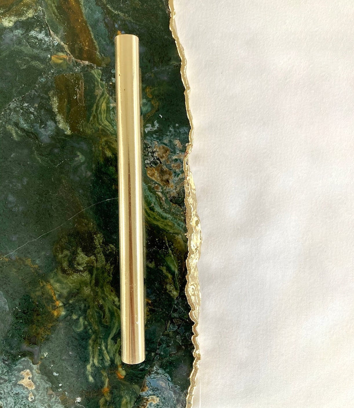 Taca została wykonana z dbałością o detale: plastry agatu o zbliżonych tonacjach zostały połączone przezroczystą żywicą epoksydową, tworząc solidną i gładką powierzchnię. Krawędzie są precyzyjnie galwanizowane grubą warstwą metalu, co zapewnia trwałość i odporność na ścieranie, w przeciwieństwie do nietrwałego złocenia płatkowego. Całość uzupełniają solidne uchwyty z litego mosiądzu.