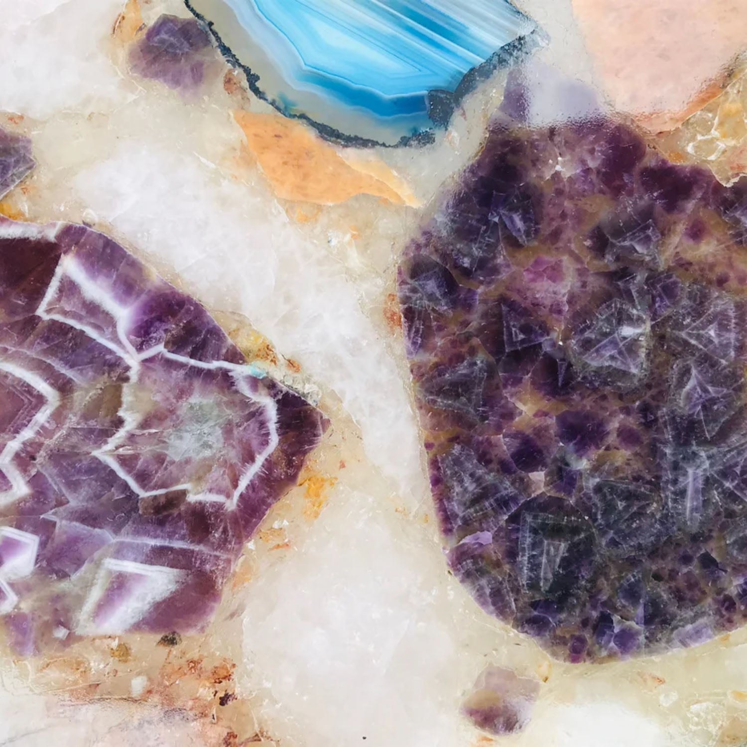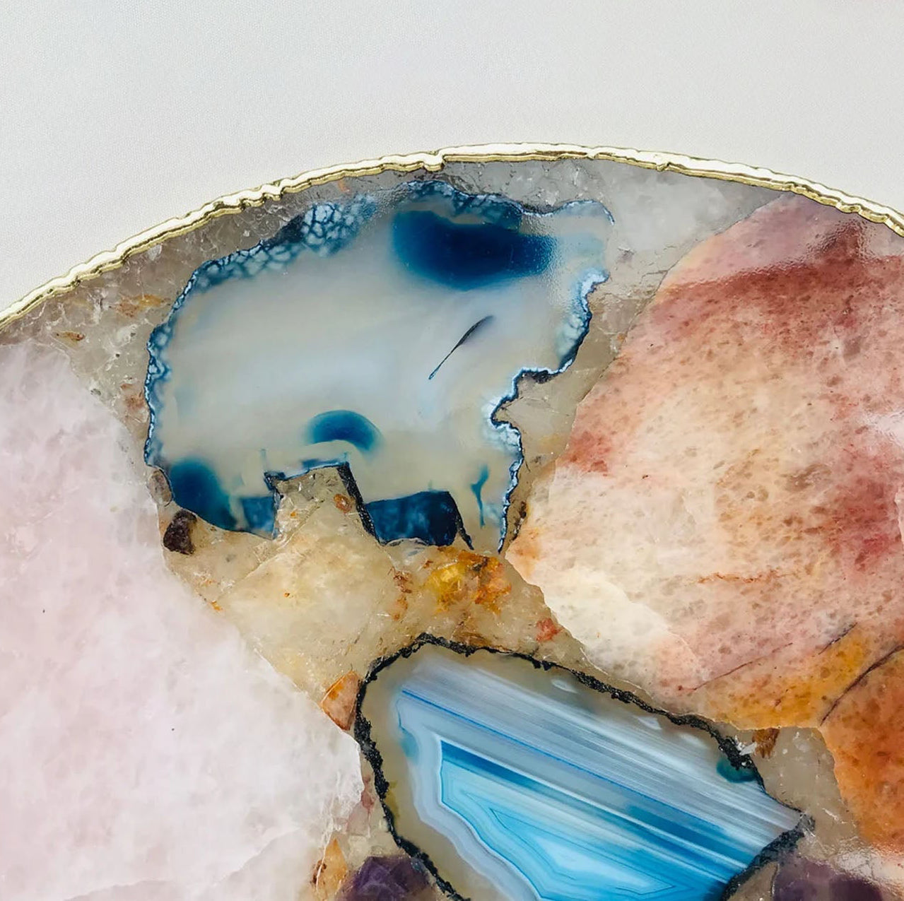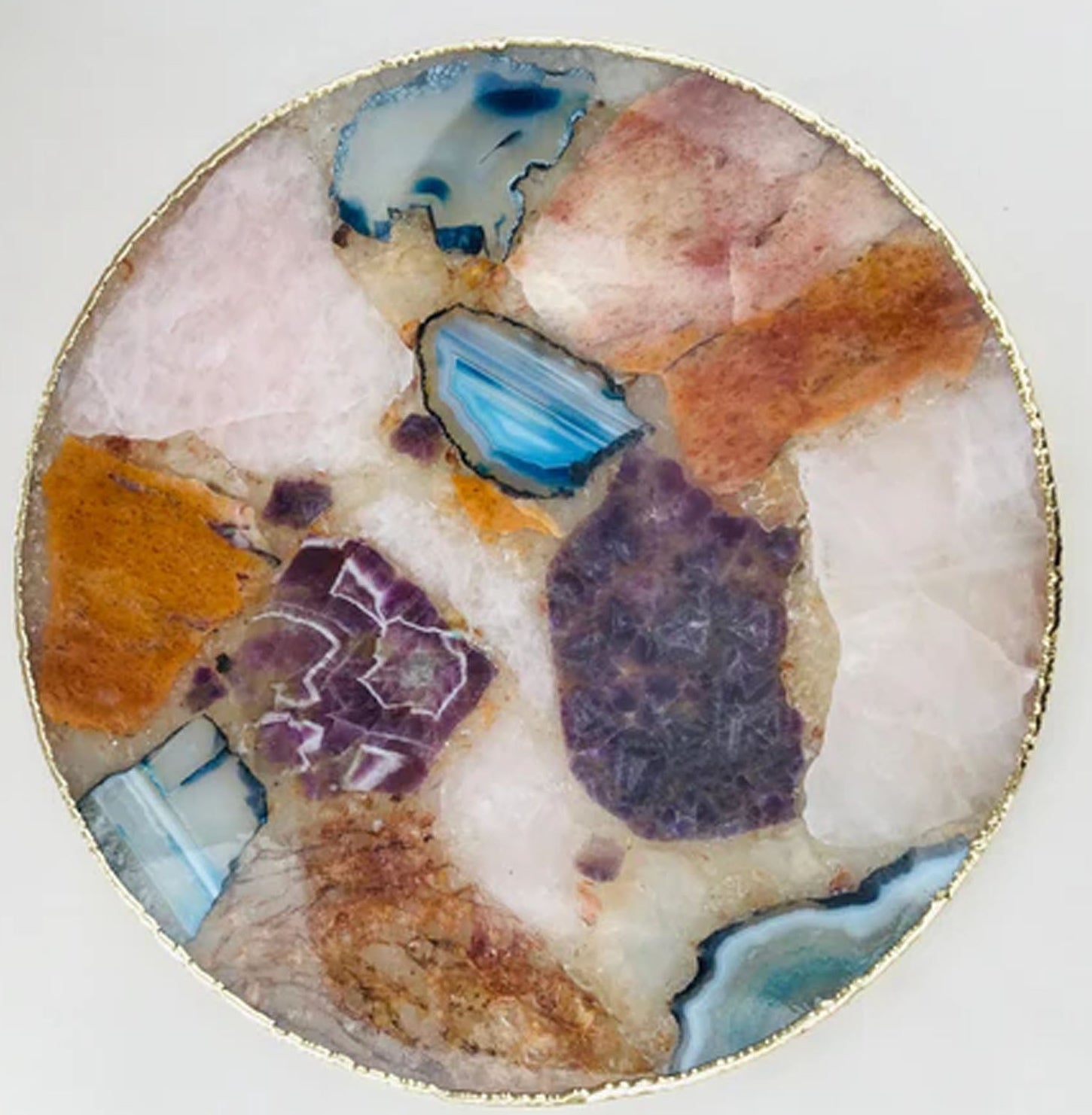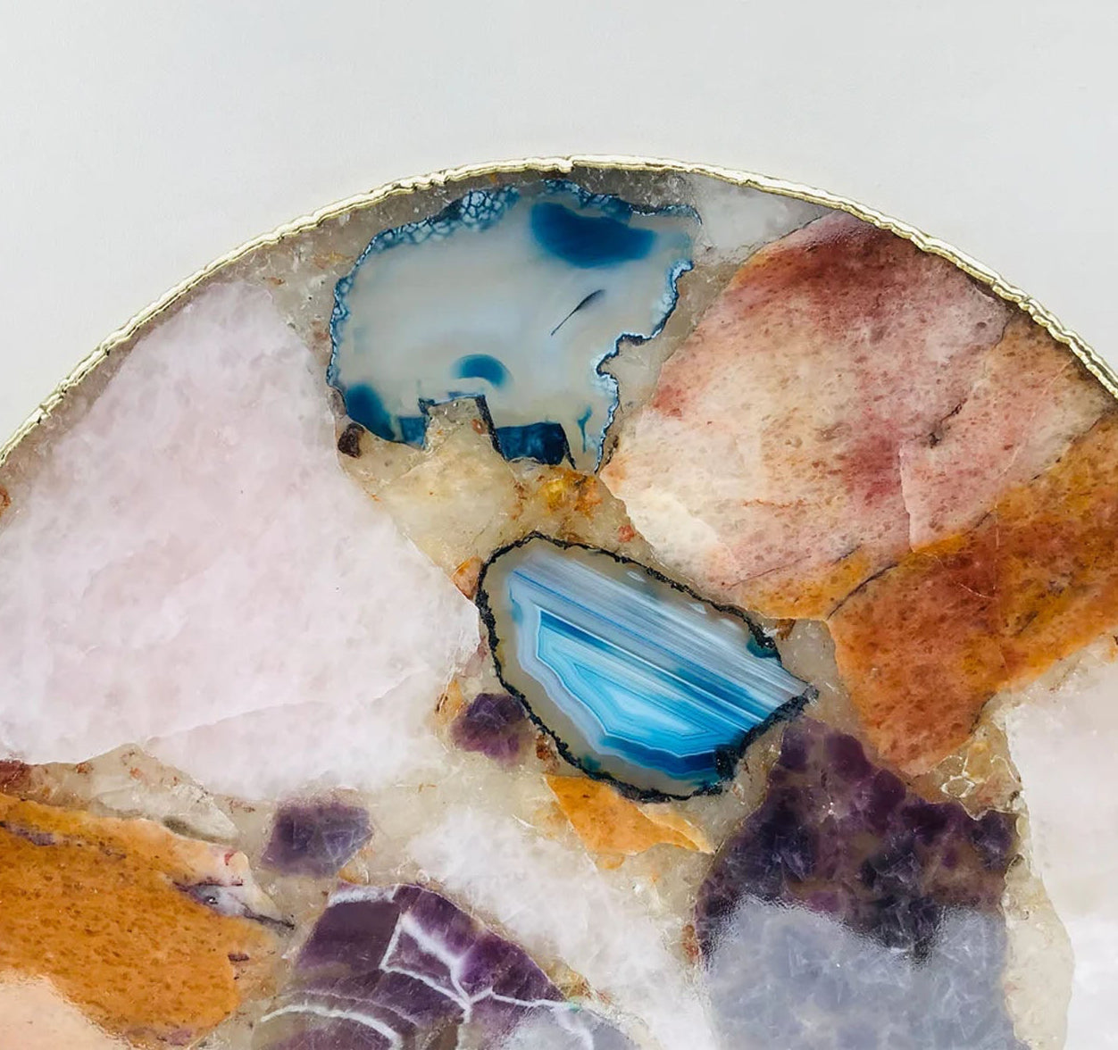 Odkryj magię natury z naszą spektakularną, okrągłą paterą. Ten wyjątkowy przedmiot łączy bogactwo barw naturalnych kamieni szlachetnych z luksusowym wykończeniem, stanowiąc zarówno praktyczną tacę do serwowania, jak i przyciągającą wzrok dekorację.