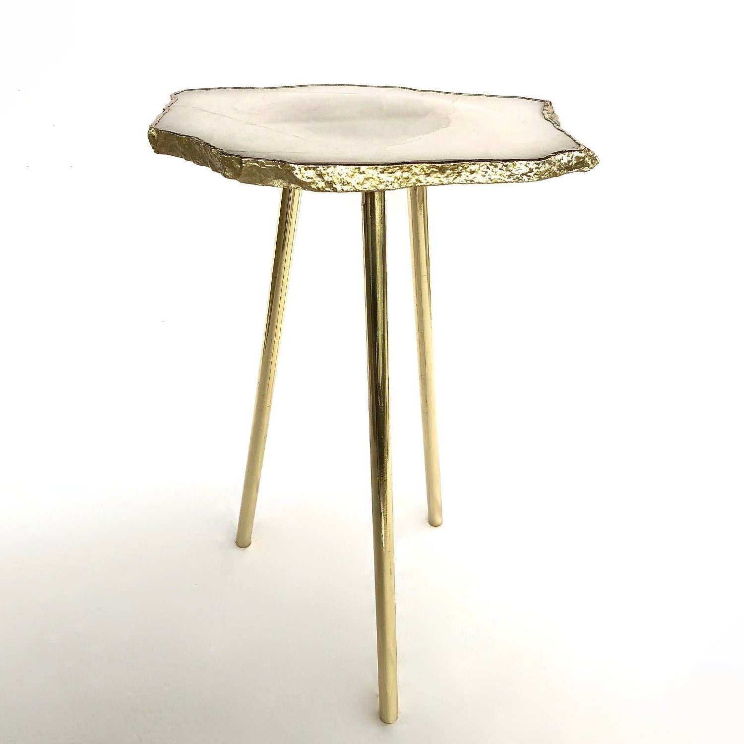 Blat stolika wykonany jest z pojedynczego, dużego plastra naturalnego białego agatu (minerał z rodziny kwarcu). Celowo zachowane, organiczne krawędzie podkreślają unikalny, rzemieślniczy charakter każdego egzemplarza. Hipnotyzujące, półprzezroczyste wzory i naturalne inkrustacje sprawiają, że każdy stolik jest absolutnie niepowtarzalny.